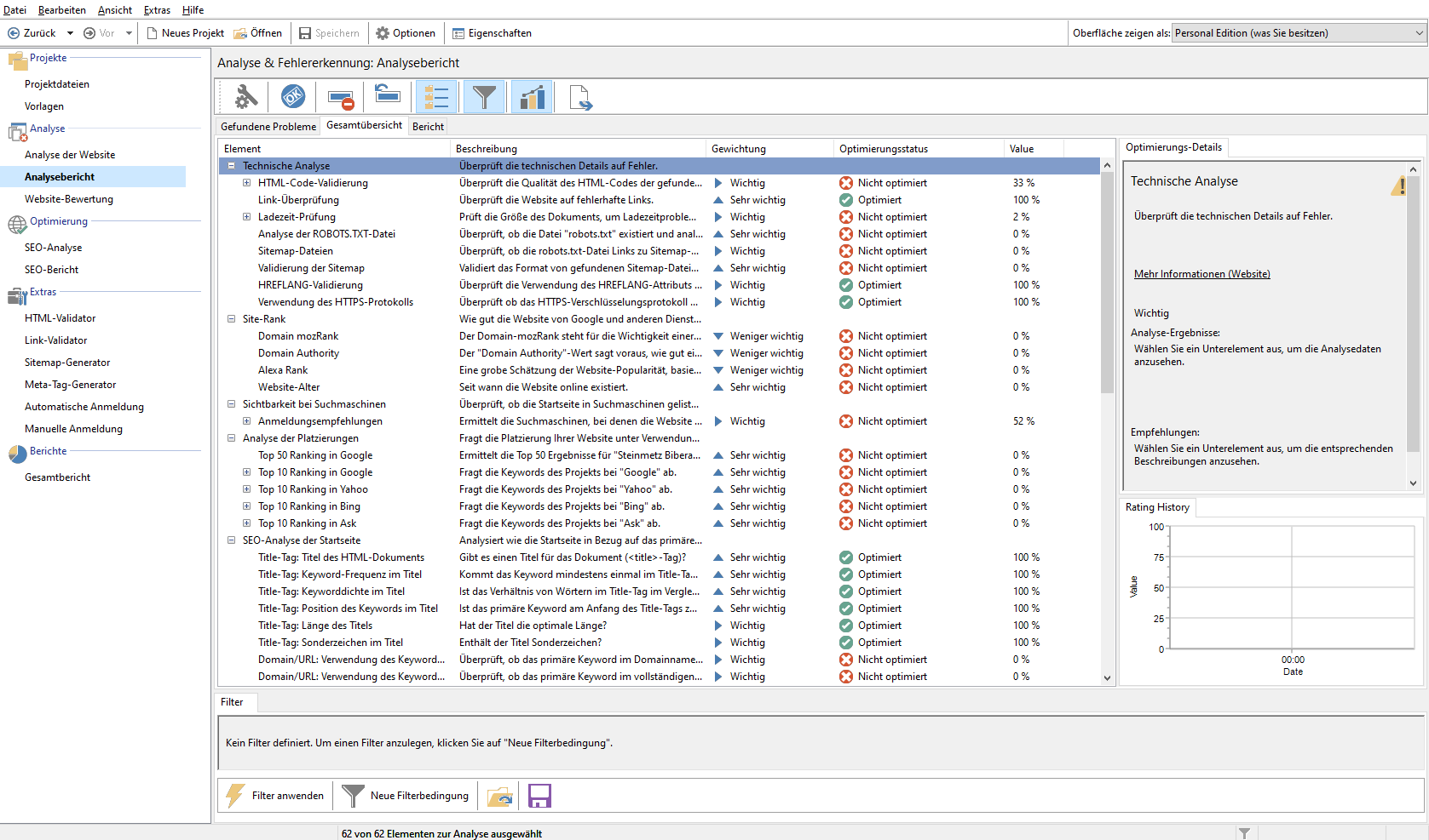 Mit moderner SEO-Software kann die Webseite analysiert und bewertet werden, SEO analysiert und Berichte erstellt sowie die Seite automatisch in Portalen eingetragen werden um das Ranking in gängigen Suchmaschinen zu verbessern.